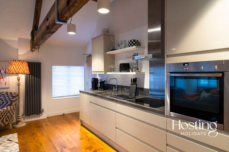 This stunning, modern Henley-on-Thames penthouse features beautiful designer furnishings by Alexander James Interiors, charming town views, a well-equipped kitchen, 50-inch smart TV, superfast WiFi, high-spec appliances, bright, airy spaces with exposed beams, and a partial river view from the bedroom.